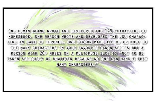 One human being wrote and developed the 129 characters of homestuck. One person wrote and developed the 500 characters in game of thrones, one person made all of or most of the many characters in your favorite canon series but a person with 20+ muses on a multimuse blog is “not to be taken seriously or whatever because no one can handle that many characters.”